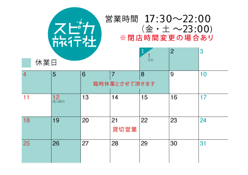 | 営業時間 | 17:30〜22:00(金・土〜23:00) (閉店時間変更の場合あり) ラストオーダー:フード21:15/ドリンク21:30 (金・土 フード22:15/ドリンク22:30) 1月の営業日 ![]() 臨時休業等カレンダーをご確認の上、お早めにご予約ください。 |