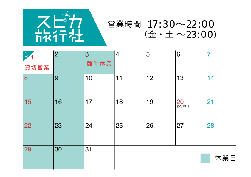 | 営業時間 | 17:30〜22:00(金・土〜23:00) (閉店時間変更の場合あり) ラストオーダー:フード21:15/ドリンク21:30 (金・土 フード22:15/ドリンク22:30) 2月の営業日 ![]() 3月の営業日 ![]() 3/3は臨時休業とさせていただきます。 |