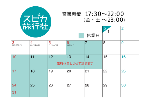 | 営業時間 | 17:30〜22:00(金・土〜23:00) (閉店時間変更の場合あり) ラストオーダー:フード21:15/ドリンク21:30 (金・土 フード22:15/ドリンク22:30) 3月の営業日 ![]() 3/3は臨時休業とさせていただきます。 |